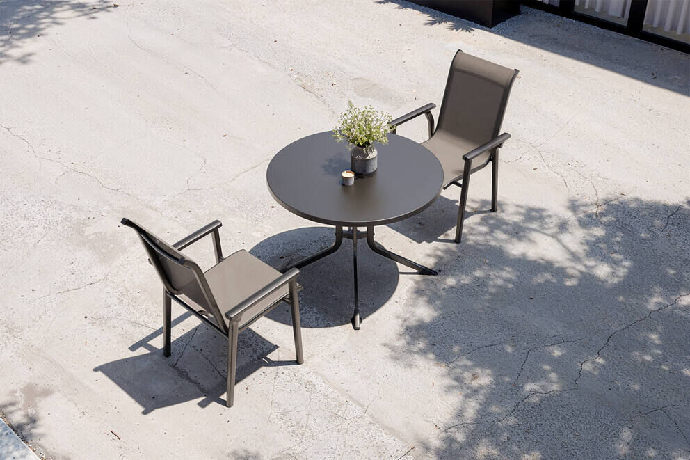 Die KETTLER BasicPlus Pro Garten-Essgruppe vereint modernen Komfort, hochwertige Materialien und zeitloses Design zu einem stilvollen Mittelpunkt für Terrasse, Balkon oder Garten. Dieses Set besteht aus einem formschönen Boulevard-Klapptisch mit einem Durchmesser von ca. 100 cm sowie zwei ergonomischen Stapelsesseln mit luftdurchlässiger Bespannung. Die harmonische Farbkombination in Anthrazit fügt sich elegant in unterschiedlichste Outdoor-Umgebungen ein und wirkt gleichermaßen modern wie einladend. Dank der verwendeten Premium-Materialien Aluminium, KETTALUX und Textilene ist das Set ideal für den dauerhaften Einsatz unter freiem Himmel geeignet.