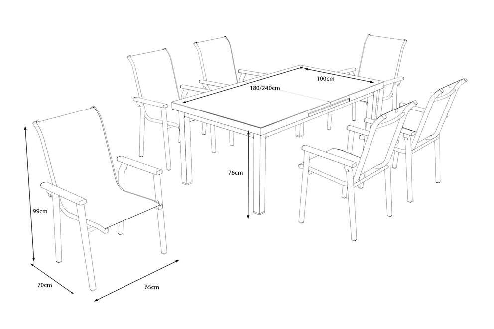 Ergänzt wird der Tisch durch sechs hochwertige KETTLER BasicPlus Pro Stapelsessel, die perfekt auf das Design des Tisches abgestimmt sind. Die Sessel bestehen aus einem langlebigen Aluminiumrahmen und einer luftdurchlässigen, schnelltrocknenden Textilene-Bespannung – ideal für warme Sommertage. Die ergonomisch geformte Rückenlehne sorgt für ein angenehmes Sitzgefühl, während das geringe Gewicht von ca. 3,75 kg jede Umstellung mühelos ermöglicht. Mit einer Tragkraft von ca. 120 kg sind die Stühle robust, verlässlich und für den intensiven Alltagsgebrauch bestens geeignet.