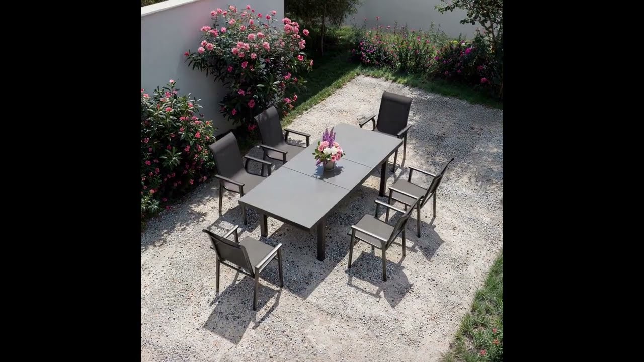 | ✔ | Modernes Design Zeitloses Anthrazit, klare Linien und eine matte Glasoberfläche schaffen eine stilvolle Atmosphäre. Die Essgruppe fügt sich harmonisch in moderne Außenbereiche ein und wertet jeden Garten optisch auf. |