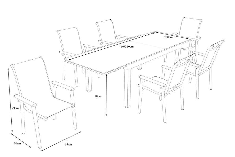 Die großzügigen Abmessungen des Ausziehtisches – ca. 160/260 cm Länge, ca. 100 cm Breite und ca. 76 cm Höhe – bieten hervorragend Platz für bis zu acht Personen. Die Sessel überzeugen mit einem Gesamtmaß von ca. 70 × 65 cm, einer Sitzhöhe von ca. 47 cm und einer bequemen Rückenlehnenhöhe von ca. 95 cm. Durch das harmonisch abgestimmte Design entsteht ein Gesamtbild, das sowohl optisch als auch funktional begeistert.
