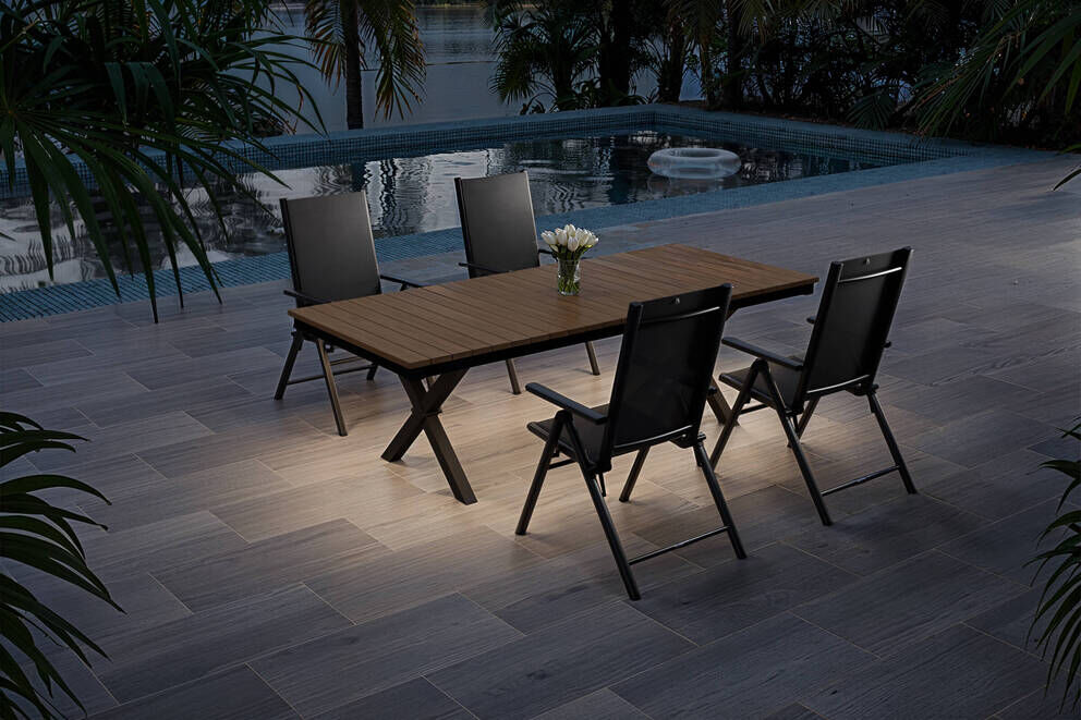 Der großzügige OUTFLEXX Luminara LED-Esstisch beeindruckt durch seine klaren Linien, das stabile X-Gestell aus pulverbeschichtetem Aluminium und die elegante Tischplatte aus Holzimitat in natürlicher Optik. Mit einer Größe von ca. 240 cm x 103 cm x 75 cm bietet er ausreichend Platz für bis zu acht Personen und schafft damit ideale Voraussetzungen für gemeinsame Mahlzeiten und entspannte Gespräche. Die LED-Lichtleiste im Tischrahmen sorgt für eine besondere Atmosphäre – ein sanftes, kaltweißes Licht, das Ihren Außenbereich abends zum Strahlen bringt und ohne Stromanschluss dank Batteriebetrieb flexibel eingesetzt werden kann.