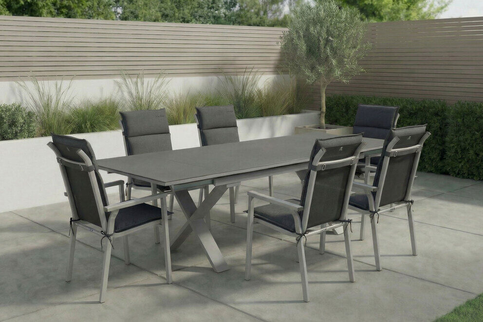Die Kombination aus langlebigem Aluminium, pflegeleichter Textilene-Bespannung, robuster Spraystone-Tischplatte und komfortablen Auflagen macht diese Garten-Essgruppe zu einem zuverlässigen Begleiter für viele Outdoor-Saisons. Ob entspanntes Frühstück, gesellige Grillabende oder gemütliche Stunden im Freien – dieses Set bietet die ideale Grundlage für stilvolle Momente im Garten.