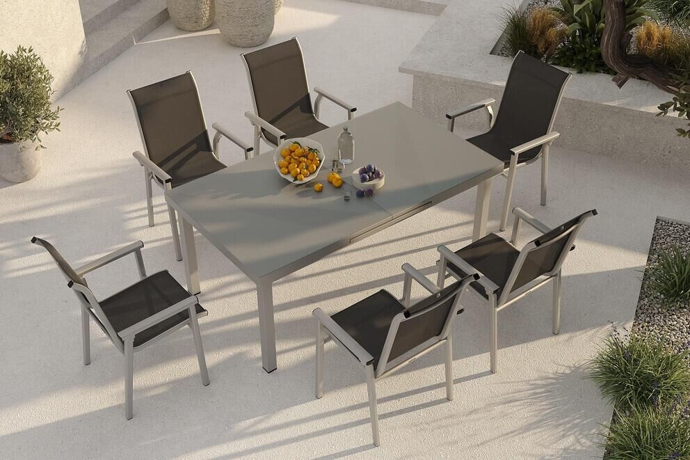 Mit der Kombination aus silberfarbenem Aluminium, anthrazitfarbenem Textilene und grauer Tischplatte fügt sich die Essgruppe harmonisch in moderne wie klassische Außenbereiche ein. Die klaren Linien und die bewusst schlichte Form verleihen dem Ensemble eine edle Wirkung, die jede Terrasse optisch aufwertet und ein einladendes Ambiente schafft. |