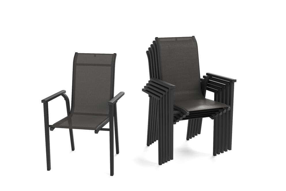 Für ein angenehmes Sitzgefühl sorgt die luftdurchlässige Bespannung aus Textilene. Das Material ist schnelltrocknend und unterstützt eine kontinuierliche Luftzirkulation, wodurch auch an warmen Tagen ein komfortables Sitzen gewährleistet wird. Die ergonomisch geformte Rückenlehne unterstützt zusätzlich eine entspannte Sitzhaltung und macht den Sessel zur idealen Wahl für lange Sommerabende im Freien.