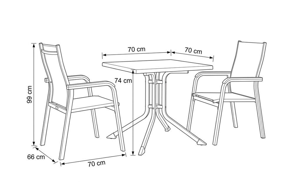 Ergänzt wird das Set durch zwei Stapelsessel der Serie BasicPlus, die mit einem leichten Aluminiumgestell in Weiß und einer luftdurchlässigen Bespannung in Hellgrau ausgestattet sind. Die ergonomisch geformte Rückenlehne sorgt für angenehmen Sitzkomfort, während die Sitzfläche aus strapazierfähigem Outdoorgewebe auch bei längerer Nutzung bequem bleibt. Mit einer Sitzhöhe von ca. 44 cm und einer Sitzbreite von ca. 49 cm bieten die Sessel eine komfortable Sitzposition. Die Armlehnen auf ca. 64 cm Höhe unterstützen zusätzlich eine entspannte Haltung.