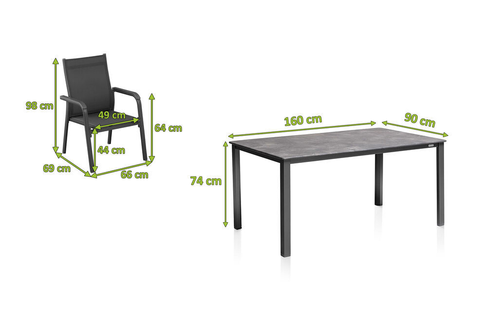 Bei dieser Esstischgruppe treffen hochwertige Materialien und Design auf modernste Weise aufeinander. Das Set besteht aus einem innovativen Esstisch der Marke KETTLER mit den Maßen von ca. 160 x 90 x 74 cm und 6 Stapelsessel der Marke KETTLER