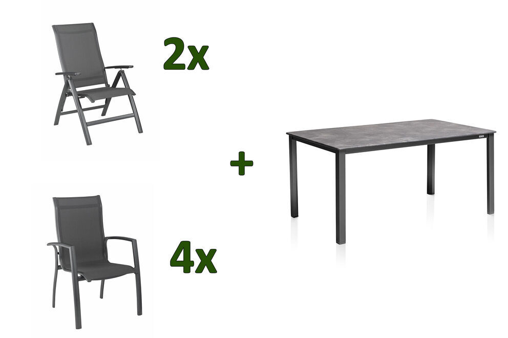 Der rechteckige Tisch für 4-6 Personen bietet Platz für eine ganze Familie. Die anthrazitfarbene Tischplatte besteht aus hochwertig verarbeitetem Kettalit und wird von einem soliden Gestell aus Aluminium in anthrazit getragen. Die positiven Eigenschaften von Aluminium sind zahlreich: Es ist leicht, wetterfest, stabil und elegant. In Kombination mit der Stabilität und der kratzfesten Oberfläche der Kettalit Tischplatte wird aus diesem Möbelstück das Highlight für Ihren Garten. Mit dem Stapelsessel aus der Legato Curve Serie mit den Maßen von ca. 68 x 65,5 x 101 cm bequem durch den Sommer. Das solide und formschöne Gestell besteht aus edlem, anthrazitfarbenen Aluminium. Die ebenfalls anthrazite Sitzfläche wird aus wasserdurchlässigem, hochwertigem Outdoorgewebe gefertigt. Die Sitzfläche nimmt kein Wasser auf und trocknet schnell, so können Sie auch nach einem kleinen Regenschauer rasch wieder Platz nehmen. Das luftige Gewebe ist formstabil und trotzdem sehr bequem und zusätzlich UV- und sonnenölbeständig - insgesamt also der perfekte Begleiter in Ihrem Garten. Die Sessel lassen sich aufstapeln - wenn sie nicht benötigt werden können Sie sie platzsparend verstauen. Der Klappstühle aus der Legato Curve Serie mit den Maßen von ca. 69 x 65 x 110,5 cm lässt sich mittels Rasterschiene leicht in 4 verschiedene Positionen bringen - so wird der Komfort eines Liegestuhls direkt integriert. Das solide und formschöne Gestell besteht aus edlem, anthrazitfarbenen Aluminium. Die ebenfalls anthrazite Sitzfläche wird aus wasserdurchlässigem, hochwertigem Outdoorgewebe gefertigt. Die Sitzfläche nimmt kein Wasser auf und trocknet schnell, so können Sie auch nach einem kleinen Regenschauer rasch wieder Platz nehmen. Das luftige Gewebe ist formstabil und trotzdem sehr bequem und zusätzlich UV- und sonnenölbeständig - insgesamt also der perfekte Begleiter in Ihrem Garten. Dank der leichten Materialien und des Klappmechanismus lässt sich der Stuhl leicht zu handhaben - wenn er nicht benötigt wird können Sie ihn platzsparend verstauen.
