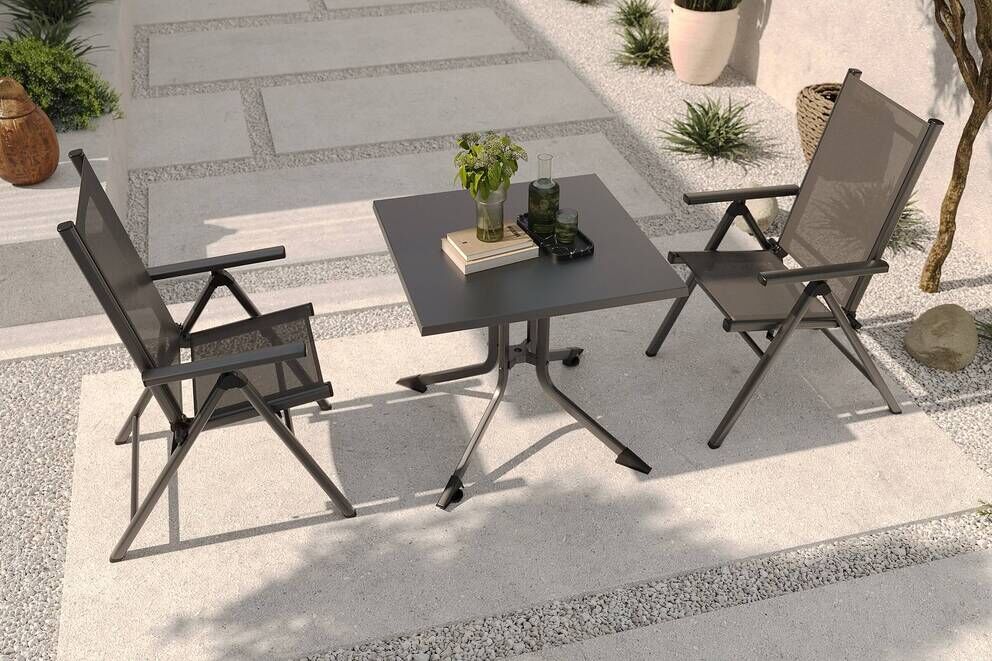 Die beiden Klappstühle der BasicPlus 2026 Linie bieten eine gelungene Kombination aus Komfort und Stabilität. Das anthrazitfarbene Aluminiumgestell sorgt für hohe Belastbarkeit von bis zu ca. 120 kg pro Stuhl und ist gleichzeitig angenehm leicht. Sitz- und Rückenflächen bestehen aus luftdurchlässigem Outdoorgewebe, das sich der Körperform anpasst und für ein angenehmes Sitzgefühl sorgt – selbst an warmen Sommertagen. Die Stühle werden bereits montiert geliefert und können direkt genutzt werden. Das Klappsystem ermöglicht eine schnelle und platzsparende Verstauung, ideal für kleinere Balkone oder den unkomplizierten Wintereinlagerungsprozess.