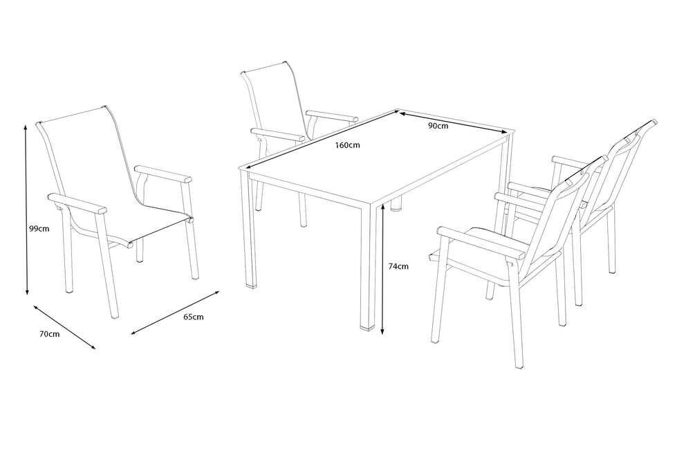 Die gesamte Essgruppe ist für den ganzjährigen Outdoor-Einsatz geeignet. Aluminium ist korrosionsbeständig, die Bespannung schnelltrocknend und die Kettalitplatte leicht zu reinigen. Verschmutzungen lassen sich bequem entfernen, sodass das Set jederzeit ein gepflegtes Erscheinungsbild behält. |