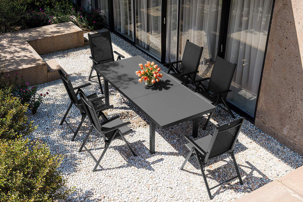 Das Farbspiel aus Anthrazit und Grau verleiht der Essgruppe eine moderne und zugleich dezente Ausstrahlung, die sich harmonisch in viele Garten- und Terrassengestaltungen einfügt. Kombiniert mit den widerstandsfähigen Materialien entsteht eine Essgruppe, die sowohl optisch als auch funktional überzeugt. Aluminium, Textilene und Sicherheitsglas bilden eine langlebige Einheit, die pflegeleicht, UV-beständig und alltagstauglich ist.
