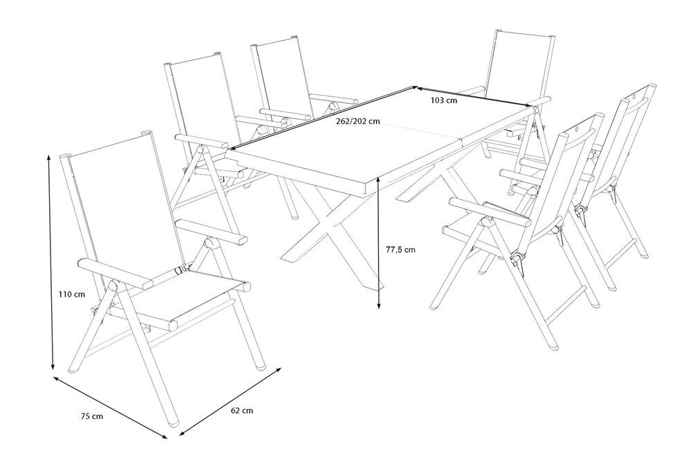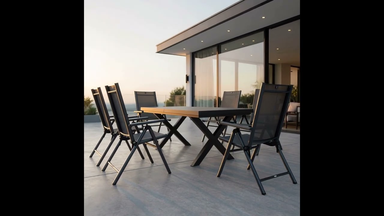Die Abmessungen der Stühle betragen ca. 75 x 62 x 110 cm und sorgen für eine angenehme Sitzposition – ideal für lange Abende am Tisch. Das Outdoorgewebe ist pflegeleicht, wetterbeständig und schnelltrocknend, während das pulverbeschichtete Aluminiumgestell zuverlässig vor Korrosion schützt. So bleibt die Essgruppe auch bei häufigem Gebrauch und unter wechselnden Witterungsbedingungen ein treuer Begleiter.