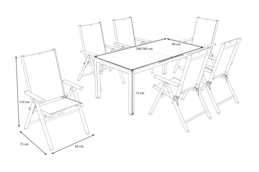 Jeder der sechs Sessel lässt sich mühelos zusammenklappen und damit besonders platzsparend verstauen. Mit einem Gewicht von nur ca. 6 kg je Stuhl lassen sich diese leicht transportieren, verschieben oder nach Bedarf flexibel aufstellen. Dies macht die Garten-Essgruppe ideal für Terrassen aller Größen – von kompakten Bereichen bis hin zu weitläufigen Gärten. |