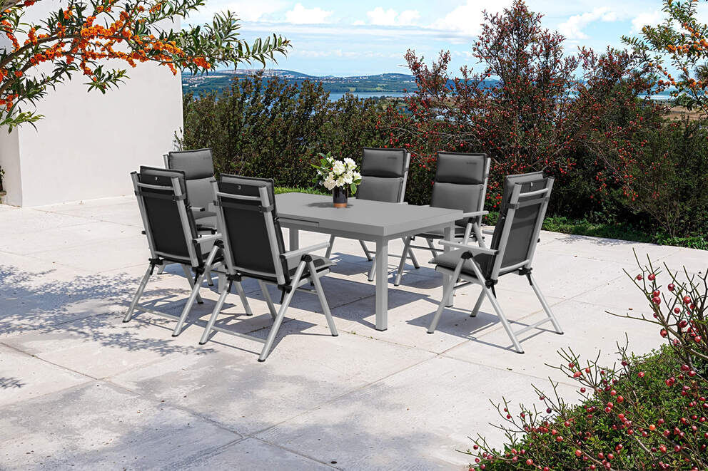 Herzstück des Sets ist der großzügige Ausziehtisch aus pulverbeschichtetem Aluminium. Die robuste Tischplatte aus gehärtetem Einscheibensicherheitsglas präsentiert sich in edlem Grau mit matter Oberfläche, die dank Siebdruckveredelung störende Lichtreflexionen minimiert. Der automatische Ausziehmechanismus macht den Tisch besonders praktisch: Durch einfaches Ziehen an einer Seite fährt die mittlere Platte sanft und selbstständig in Position. Mit einer variablen Länge von ca. 180–240 cm bietet der Tisch komfortabel Platz für ca. 6–8 Personen. Das stabile Aluminiumgestell überzeugt durch seine Korrosionsbeständigkeit, UV-Beständigkeit und einfache Pflege, während integrierte Fußkappen für einen sicheren Stand sorgen.