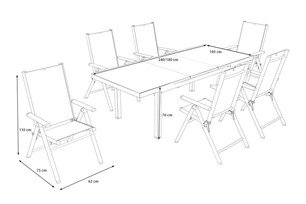 Die sechs Klappstühle mit mehrfach verstellbarer Rückenlehne bieten individuelle Sitzpositionen – von aufrecht bis entspannt zurückgelehnt. Das atmungsaktive Outdoorgewebe sorgt dabei für ein angenehmes Sitzgefühl, auch an warmen Tagen, und bleibt formstabil und schmutzabweisend. |