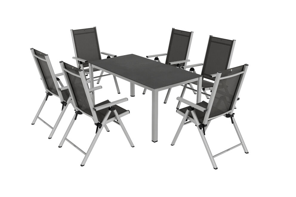 Die gesamte Essgruppe zeichnet sich durch langlebige Materialien sowie eine hohe Verarbeitungsqualität aus. Aluminium und Outdoorgewebe gelten als besonders pflegeleicht und sind bestens für den dauerhaften Einsatz im Freien geeignet. Auch die Spraystone-Tischplatte ist robust und alltagstauglich. Optisch fügt sich das Ensemble durch die harmonische Farbkombination aus Silber, & Anthrazitstilvoll in moderne wie klassische Außenbereiche ein.