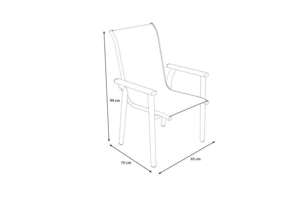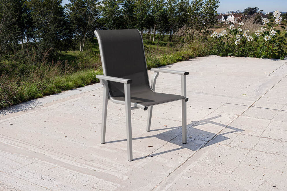 Das Gestell besteht aus leichtem, korrosionsbeständigem Aluminium, das durch die silberfarbene Oberfläche einen modernen Akzent setzt und zugleich für hohe Stabilität sorgt. Das anthrazitfarbene Textilene der Sitz- und Rückenfläche ist luftdurchlässig, formbeständig und angenehm im Hautkontakt – selbst an warmen Sommertagen. Dank dieses Materials bleibt der Sitzkomfort dauerhaft erhalten, während das Gewebe zügig trocknet und pflegeleicht bleibt. Die ergonomisch geformte Rückenlehne erhöht den Komfort zusätzlich und macht den Sessel auch für längere Sitzzeiten geeignet.