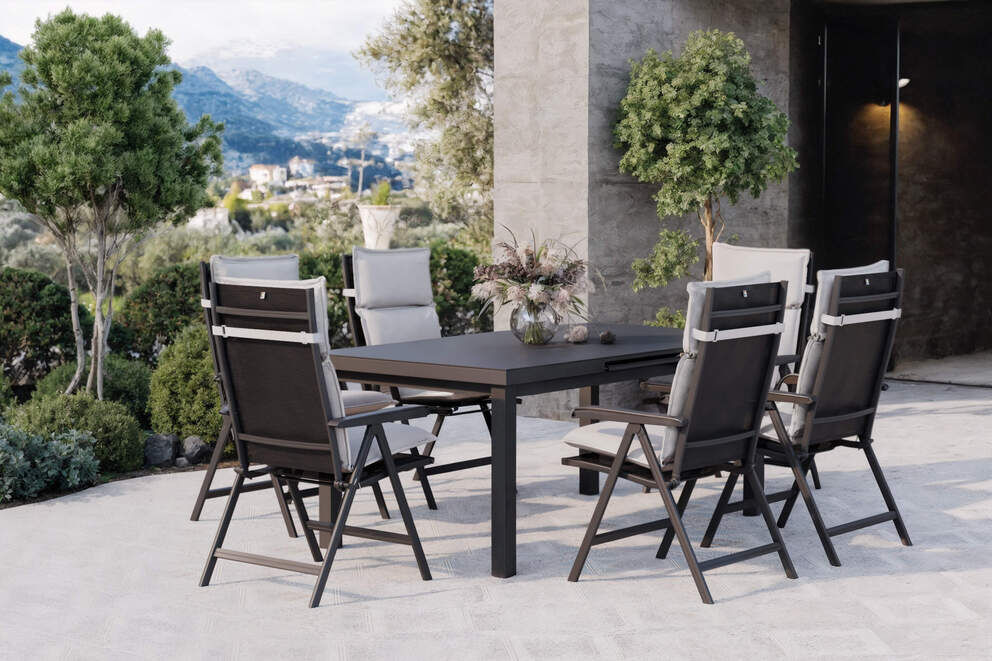 Aluminium, Glas und Textilene sind besonders pflegeleicht und witterungsbeständig. Die Sitzkissen mit wasser- und schmutzabweisendem Bezug lassen sich leicht reinigen – perfekt für den täglichen Einsatz im Freien. |