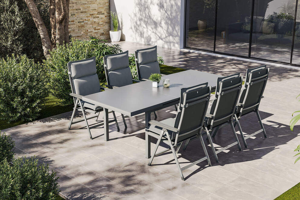 Die sechs mitgelieferten Hochlehner-Stühle von KETTLER (ca. 65 x 61 x 109 cm) vereinen ergonomischen Komfort mit Flexibilität. Sie sind mehrfach verstellbar und lassen sich bei Bedarf zusammenklappen – perfekt für platzsparende Lagerung. Die atmungsaktive Bespannung aus Textilene in Anthrazit ist wetterfest, schnelltrocknend und angenehm auf der Haut – selbst bei hohen Temperaturen. Mit einer Belastbarkeit von bis zu ca. 120 kg pro Stuhl und einem Gewicht von nur ca. 5 kg lassen sich die Sessel leicht handhaben und versprechen langanhaltenden Komfort.