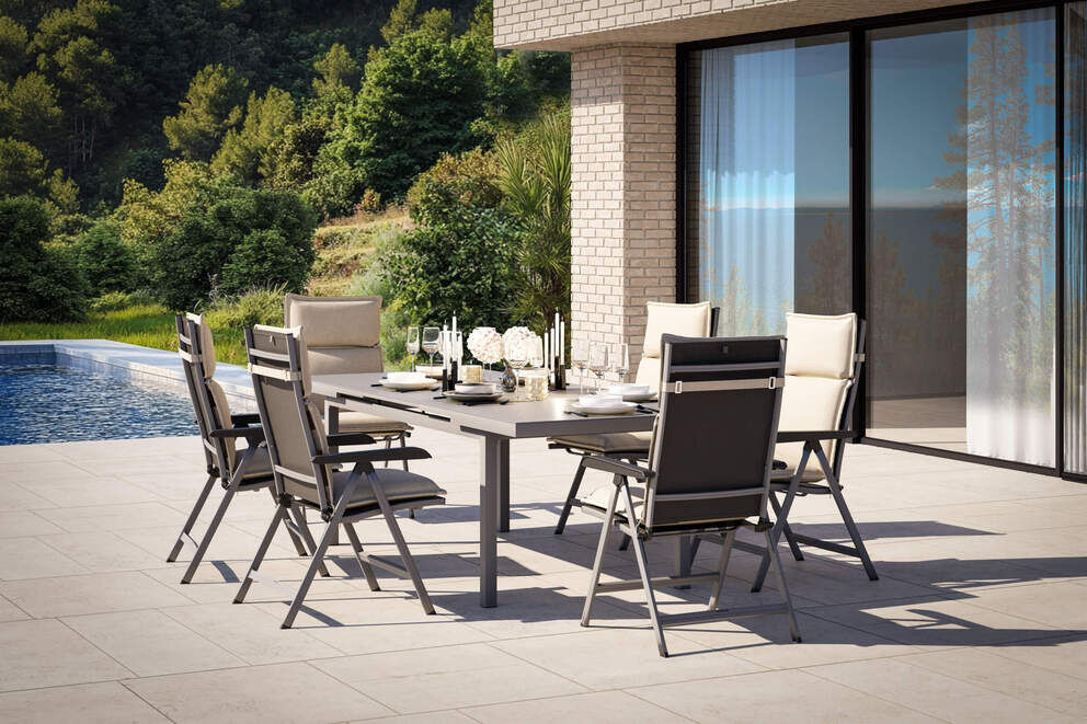 Bei dieser Esstischgruppe treffen hochwertige Materialien und Design auf modernste Weise aufeinander. Das Set besteht aus einem innovativen Premium Ausziehtisch der Marke OUTFLEXX mit den Maßen von ca. 180/240 x 100 x 76 cm und 6 Klappstühlen der Marke Kettler aus der Serie 'BasicPlus'.