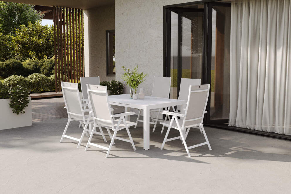 Die Kombination aus weiß matt lackiertem Aluminium, hellgrauem Outdoorgewebe und einer Glas-Tischplatte verleiht dieser Essgruppe eine zeitlose Eleganz, die sich perfekt in jede Garten- oder Terrassenlandschaft einfügt. |