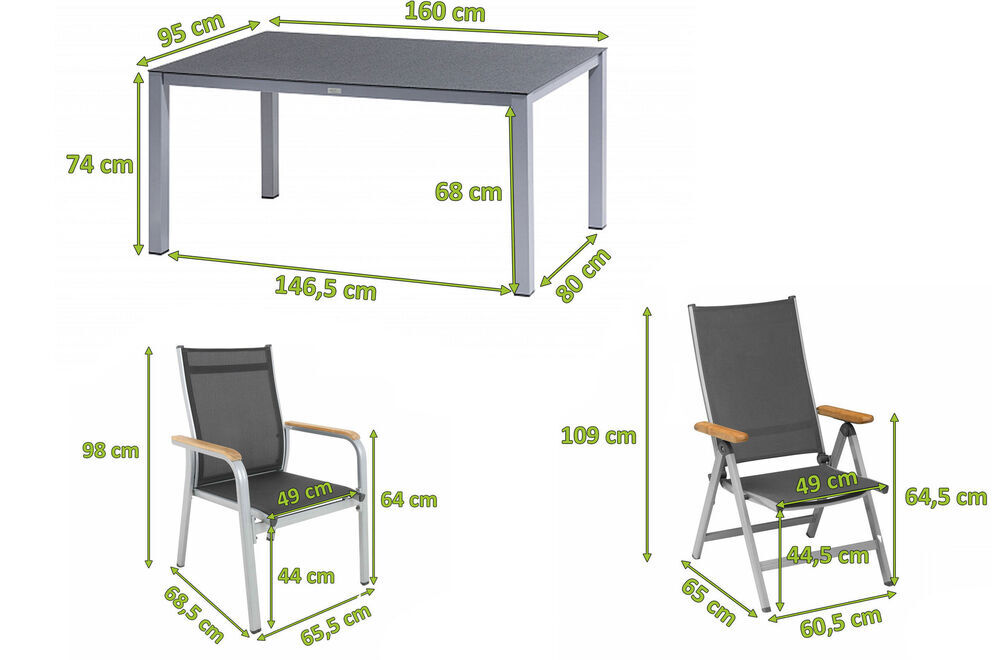 Mit den Multipostionssesseln der Serie Granada können Sie den Sommer genießen. Mittels Rasterschiene lässt sich der Sessel leicht in 4 verschiedene Positionen bringen - so wird der Komfort eines Liegestuhls direkt integriert. Das solide und formschöne Gestell besteht aus edlem, silberfarbenen Aluminium, wobei die Armlehnen aus FSC-zertifiziertem Teakholz für einen zusätzlichen Blickfang sorgen. Die anthrazitfarbene Sitzfläche wird aus wasserdurchlässigem, hochwertigem Kunststoffgewebe (70% PVC + 30% PES) gefertigt. Die Sitzfläche nimmt kein Wasser auf und trocknet schnell, so können Sie auch nach einem kleinen Regenschauer rasch wieder Platz nehmen. Das luftige Gewebe ist formstabil und trotzdem sehr bequem und zusätzlich UV- und sonnenölbeständig - insgesamt also der perfekte Begleiter in Ihrem Garten. Dank der leichten Materialien und des Klappmechanismus lässt sich der nur ca. 6,5 kg leichte Stuhl leicht handhaben - wenn er nicht benötigt wird, können Sie ihn platzsparend verstauen.