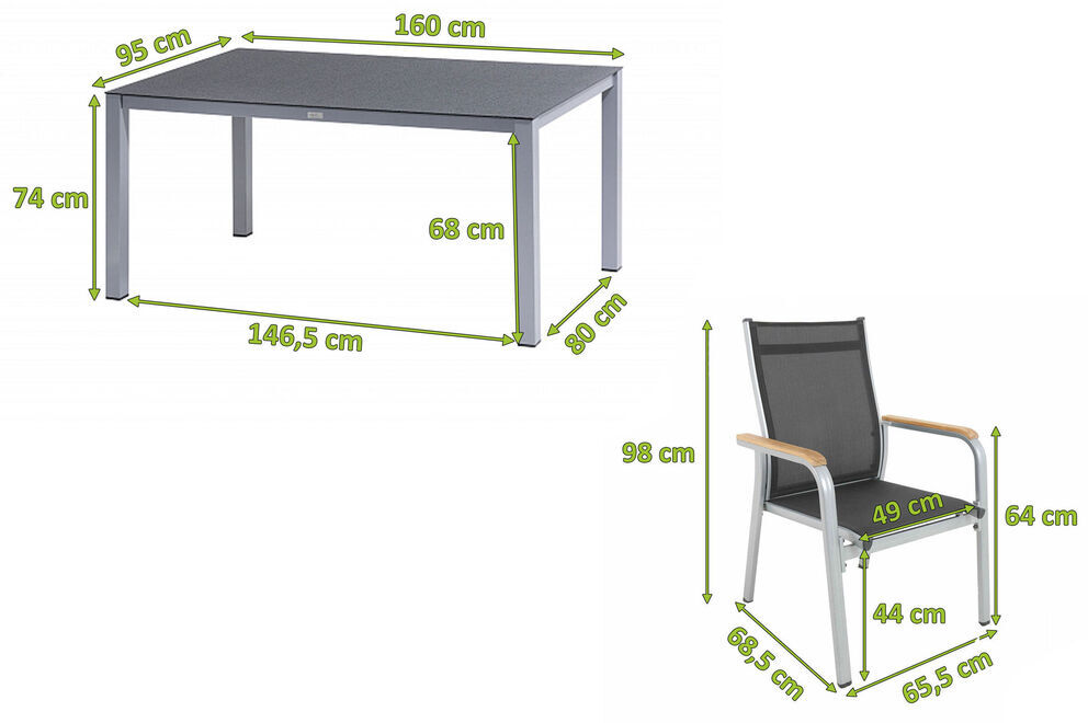 Mit den Stapelsesseln aus der Serie Granada bequem durch den Sommer. Das solide und formschöne Gestell besteht aus edlem, silberfarbenem Aluminium, wobei die Armlehnen aus FSC-zertifiziertem Teakholz für einen zusätzlichen Blickfang sorgen. Die anthrazitfarbene Sitzfläche wird aus wasserdurchlässigem, hochwertigem Kunststoffgewebe (70% PVC + 30% PES) gefertigt. Die Sitzfläche nimmt kein Wasser auf und trocknet schnell, so können Sie auch nach einem kleinen Regenschauer rasch wieder Platz nehmen. Das luftige Gewebe ist formstabil und trotzdem sehr bequem und zusätzlich UV- und sonnenölbeständig - insgesamt also der perfekte Begleiter in Ihrem Garten. Die nur ca. 5,5 kg schweren Sessel lassen sich aufstapeln - wenn sie nicht benötigt werden, können Sie sie platzsparend verstauen.