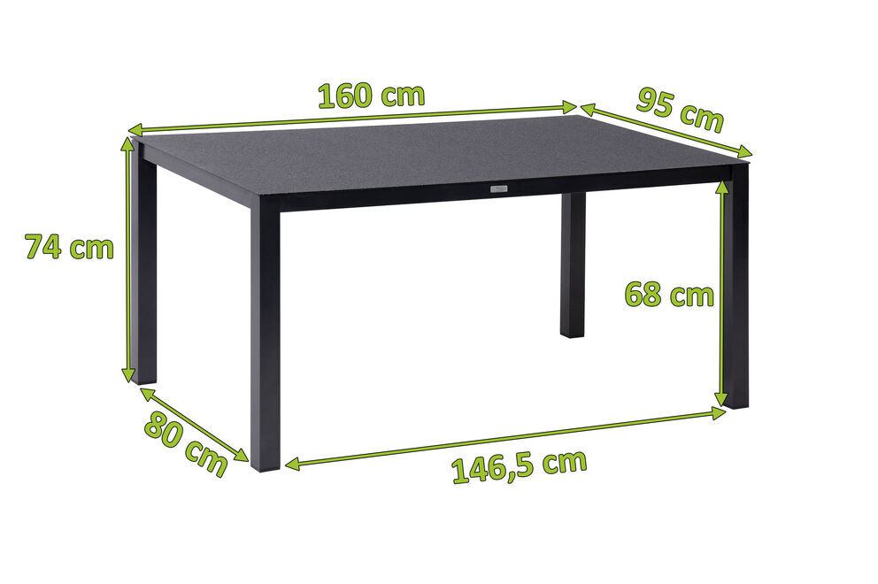 Der Tisch, gefertigt aus einer harmonischen Kombination von robustem Aluminium und edlem Spraystone, präsentiert sich in einem zeitlosen Anthrazit. Mit einer ca. Größe von 160x95 cm bietet er genügend Platz für ein ausgiebiges Mahl oder entspannte Kaffeerunden in geselliger Runde. Der Clou: Die Tischplatte in Spraystone-Optik ist nicht nur ein Blickfang, sondern besticht auch durch ihre Pflegeleichtigkeit und Witterungsbeständigkeit.