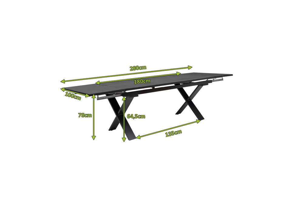 Der im Set enthaltene Ausziehtisch besticht durch seine moderne anthrazitfarbene Aluminiumkonstruktion mit einer eleganten Spraystone-Tischplatte in Schwarz. Mit einer Größe von ca. 180/280x100 cm bietet er großzügigen Platz für Ihre Familie und Gäste. Die ausziehbare Funktion ermöglicht eine flexible Anpassung an Ihre Bedürfnisse, ob für eine gemütliche Kaffeerunde oder ein großes Gartenfest.