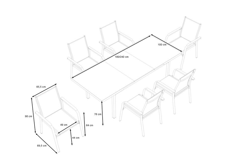 Bei dieser Esstischgruppe treffen hochwertige Materialien und Design auf modernste Weise aufeinander. Das Set besteht aus einem innovativen Premium Ausziehtisch der Marke OUTFLEXX mit den Maßen von ca. 180/240 x 100 x 76 cm und 6 Stapelsesseln der Marke Kettler aus der Serie 'Granada'.