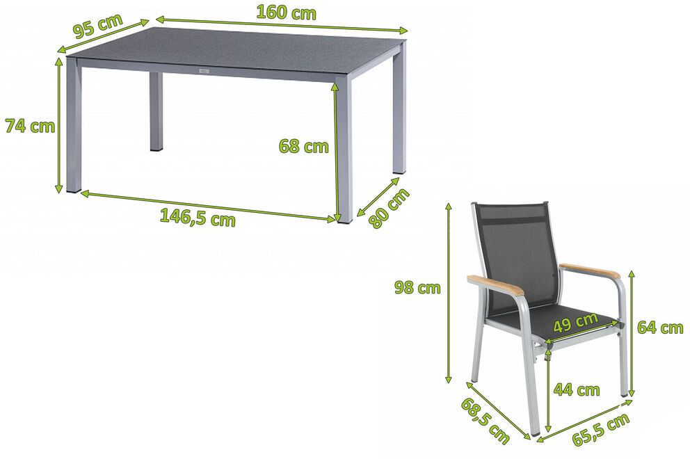 Mit den Stapelsesseln aus der Serie Granada bequem durch den Sommer. Das solide und formschöne Gestell besteht aus edlem, silberfarbenem Aluminium, wobei die Armlehnen aus FSC-zertifiziertem Teakholz für einen zusätzlichen Blickfang sorgen. Die anthrazitfarbene Sitzfläche wird aus wasserdurchlässigem, hochwertigem Kunststoffgewebe (70% PVC + 30% PES) gefertigt. Die Sitzfläche nimmt kein Wasser auf und trocknet schnell, so können Sie auch nach einem kleinen Regenschauer rasch wieder Platz nehmen. Das luftige Gewebe ist formstabil und trotzdem sehr bequem und zusätzlich UV- und sonnenölbeständig - insgesamt also der perfekte Begleiter in Ihrem Garten. Die nur ca. 5,5 kg schweren Sessel lassen sich aufstapeln - wenn sie nicht benötigt werden, können Sie sie platzsparend verstauen.