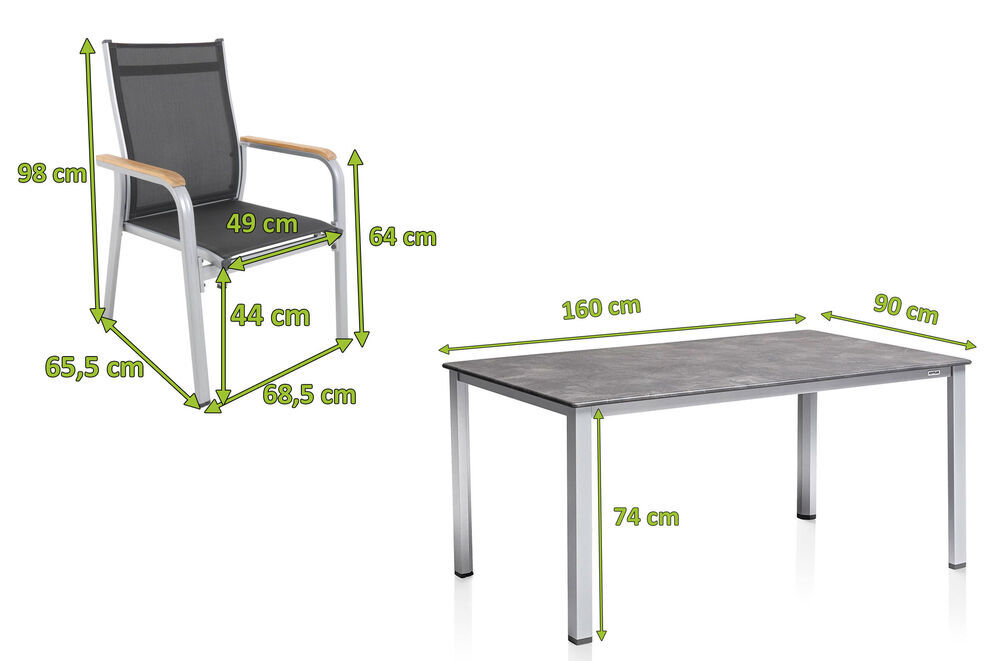 Der Tisch und die Stühle sind aus robustem Aluminium gefertigt, das nicht nur leicht und pflegeleicht ist, sondern auch langlebig und wetterfest. Die Granada Stapelsessel mit den Maßen von jeweils ca. 68,5 x 65,5 x 98 cm sind die perfekten Begleiter, lassen sich einfach umstellen und sind stets flexibel. Dank des geringen Eigengewichts von ca. 5,5 kg lässt sich der Stuhl flexibel bewegen. Wird ein Sessel einmal nicht benötigt kann dieser gestapelt und platzsparend verstaut werden. Das solide und formschöne Gestell besteht aus edlem, silberfarbenen Aluminium, wobei die Armlehnen aus FSC-zertifiziertem Teakholz für einen zusätzlichen Blickfang sorgen. Die anthrazitfarbene Sitzfläche wird aus wasserdurchlässigem, hochwertigem Kunststoffgewebe (70% PVC + 30% PES) gefertigt. Die Sitzfläche nimmt kein Wasser auf und trocknet schnell, so können Sie auch nach einem kleinen Regenschauer rasch wieder Platz nehmen. Das luftige Gewebe ist formstabil und trotzdem sehr bequem und zusätzlich UV- und sonnenölbeständig - insgesamt also der perfekte Begleiter in Ihrem Garten.