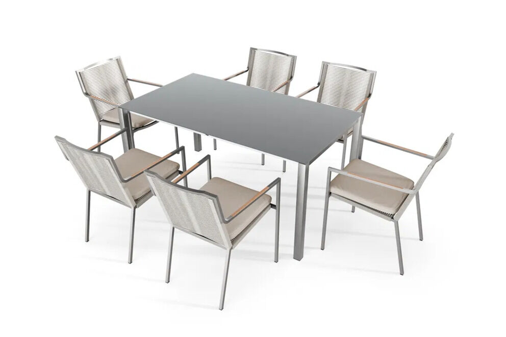 Darüber hinaus bietet die Essgruppe mit ihrem zeitlosen Design und den dezenten Farbtönen in Graubraun und Anthrazit eine stilvolle Ergänzung für jede Art von Außenbereich – ob Terrasse, Balkon oder Garten. Die harmonische Kombination aus Edelstahl, Teakholz und Rope schafft eine einladende Atmosphäre und verleiht Ihrem Außenbereich einen Hauch von Luxus.