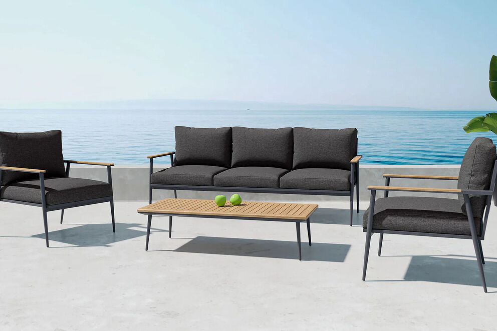 Die Gartenlounge besteht aus einem großzügigen 3-Sitzer-Sofa, zwei bequemen Sesseln und einem stilvollen Couchtisch mit naturfarbener Teakholzplatte. Die pulverbeschichteten Aluminiumrahmen der Möbel in Anthrazit sind nicht nur rostfrei, sondern auch äußerst robust und pflegeleicht. Die 4,5 cm breiten Armlehnenauflagen aus Teakholz unterstreichen den exklusiven Stil dieser Loungegruppe und verleihen ihr eine warme, natürliche Note. Zudem sind die Möbel wetterbeständig und für den dauerhaften Einsatz im Freien bestens geeignet.