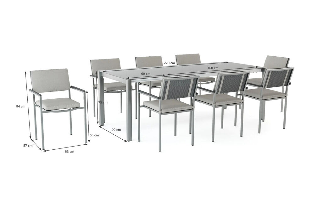 Lieferumfang:Die Lieferung umfasst einen ausziehbaren Esstisch (ca. 160 cm, ausziehbar auf ca. 220 cm), acht Stühle sowie die passenden Sitz- und Rückenkissen. Dank der stapelbaren Stühle und des ausziehbaren Tisches lässt sich das Set flexibel und platzsparend einsetzen.