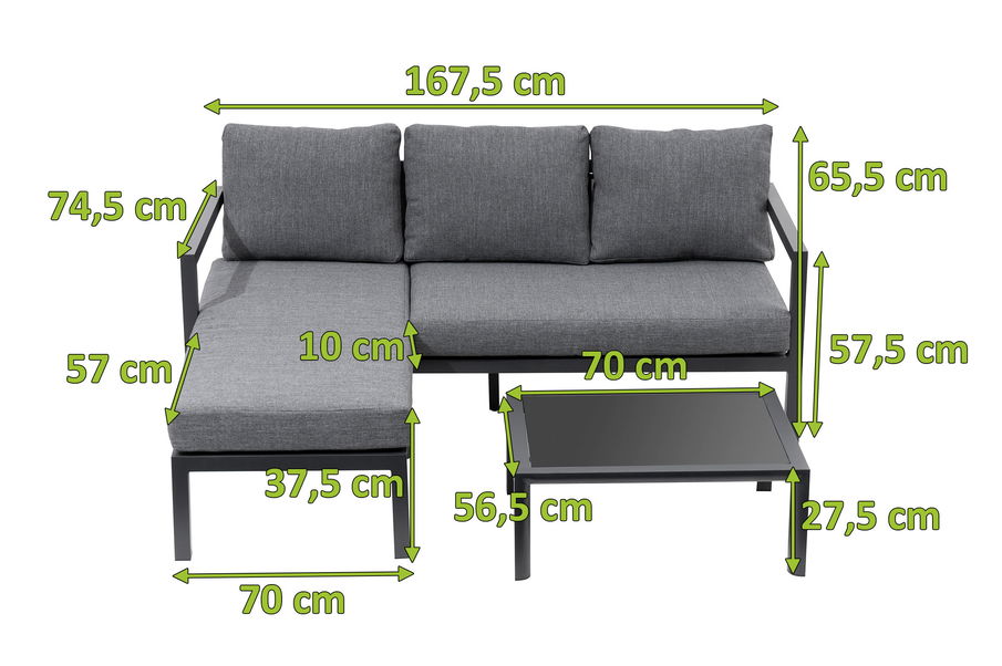 Machen Sie die Ecklounge zum Mittelpunkt Ihres Outdoor-Bereiches: Gönnen Sie sich zu zweit eine Auszeit und legen Sie Ihre Beine hoch oder genießen Sie zu dritt den Garten in entspannter Atmosphäre – diese Ecklounge ist Ihr zuverlässiger Partner für angenehme Stunden im Freien. Sie erhalten harmonisch aufeinander abgestimmte Möbelstücke, die zusammen einen einheitlichen Wohlfühlbereich bilden. Die Ecklounge besteht aus einem 3-Sitzer Sofa, einem Hocker und einem Kaffeetisch. Das 3-Sitzer Sofa verfügt über schicke Armlehnen und ist mit Textil in der Farbe anthrazit bespannt. Den Hocker können Sie zudem variabel auf der rechten oder linken Seite anbringen, wenn Sie die beiden Sitzmöbel einmal getrennt aufstellen möchten. Bei einem Gewicht von ca. 29 kg ist das Gesamset leicht und je nach Wunsch umzustellen. Mit Maßen von ca. 167 x 75 x 66 cm biete Ihnen das 3-Sitzer Sofa eine großzügige Sitzbreite von ca. 61 cm. Selbstverständlich dürfen auch die passenden Polster nicht fehlen. Die ca. 10 cm dicken Kissen verfügen über einen Bezug aus gesponnenem Polyester in der Farbe anthrazit. Sie sorgen für noch mehr Wohlbefinden und laden jederzeit zu einem kleinen Nickerchen ein. Die schlichten und zugleich markanten Rücken- und Armlehnen bestehen aus pulverbeschichtetem Aluminium, das den Sitzmöbeln Halt, Komfort und einen einmaligen Charme verleiht.