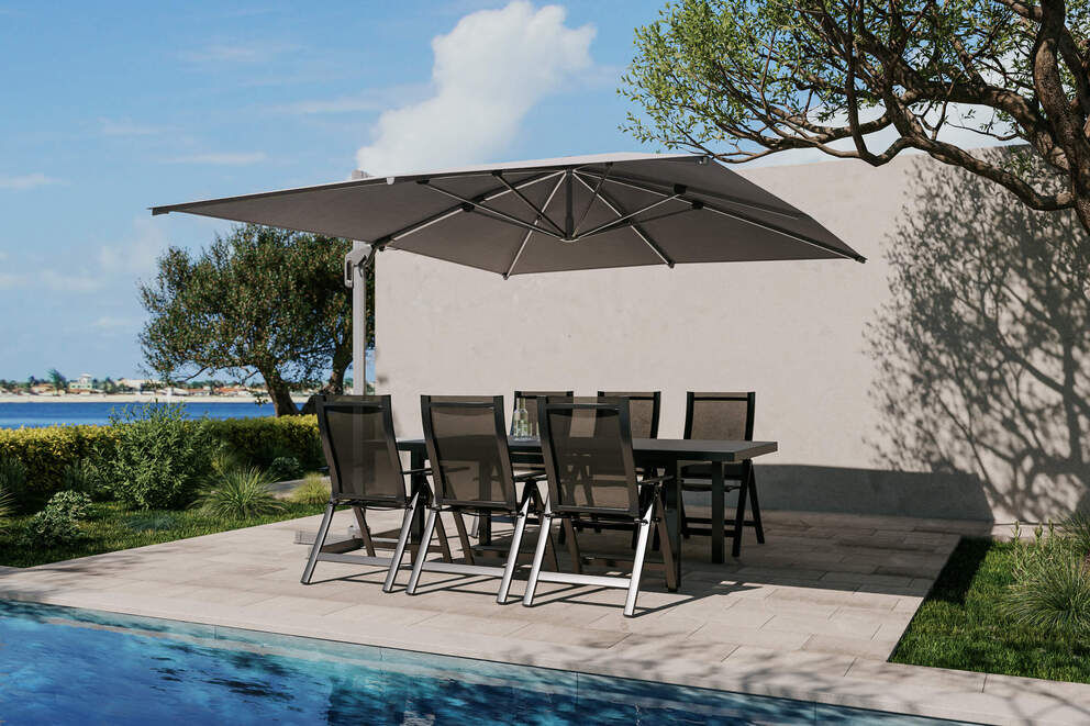 Verwandeln Sie Ihre Terrasse oder Ihren Garten in eine stilvolle Wohlfühloase mit dem hochwertigen Gartenmöbel-Set „Almeria“ von OUTFLEXX. Diese exklusive Essgruppe mit Ampelschirm kombiniert modernes Design mit herausragender Funktionalität und schafft den perfekten Rahmen für gesellige Abende, entspannte Nachmittage oder ausgiebige Mahlzeiten im Freien.
