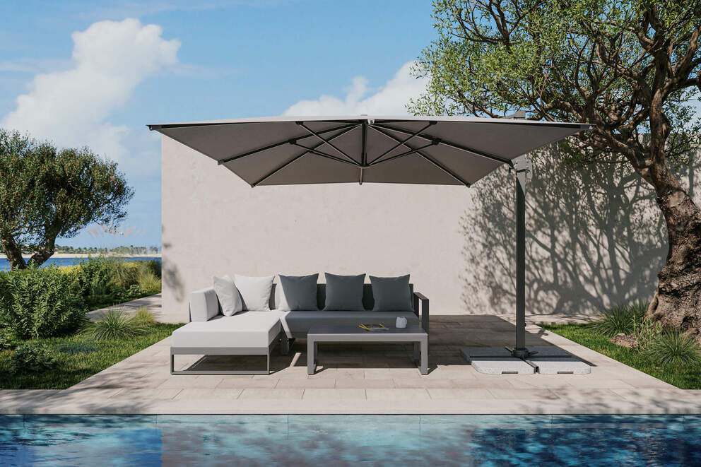 Für optimalen Sonnenschutz sorgt der im Set enthaltene SCHNEIDER Ampelschirm Rhodos Grande. Mit einer imposanten Schirmgröße von ca. 400 x 300 cm spendet er großzügig Schatten. Die wasserabweisend imprägnierte Bespannung aus 100 % Polyester (ca. 200 g/m²) in elegantem Silbergrau bietet UV-Schutz 50+ gemäß AS/NZS4399:1996 und ist abnehmbar für die Handwäsche. Die stabile, pulverbeschichtete Aluminiumkonstruktion in anthrazitgrau lässt sich über einen Drehteller mit Fußpedal um 360° drehen und flexibel neigen. Acht stabile Stahlstreben (je ca. 25 x 17 mm) sowie ein einteiliger Schirmstock (ca. 93 x 57 mm, oval) garantieren zuverlässige Standfestigkeit. Der Schirm wird inklusive Plattenständer für Wegeplatten (50 x 50 cm, nicht enthalten) geliefert.