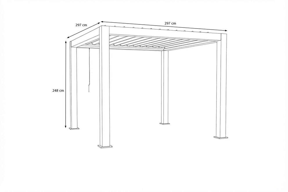 Erleben Sie stilvolle Outdoor-Momente mit der OUTFLEXX Lamellenpergola Antalya. Diese hochwertige Pergola verbindet elegantes Design mit höchster Funktionalität und schafft einen exklusiven Rückzugsort in Ihrem Garten, auf der Terrasse oder am Pool. Mit einer Größe von ca. 300 x 300 x 248 cm bietet sie großzügigen Schatten und optimalen Schutz – perfekt für entspannte Stunden im Freien bei jedem Wetter.