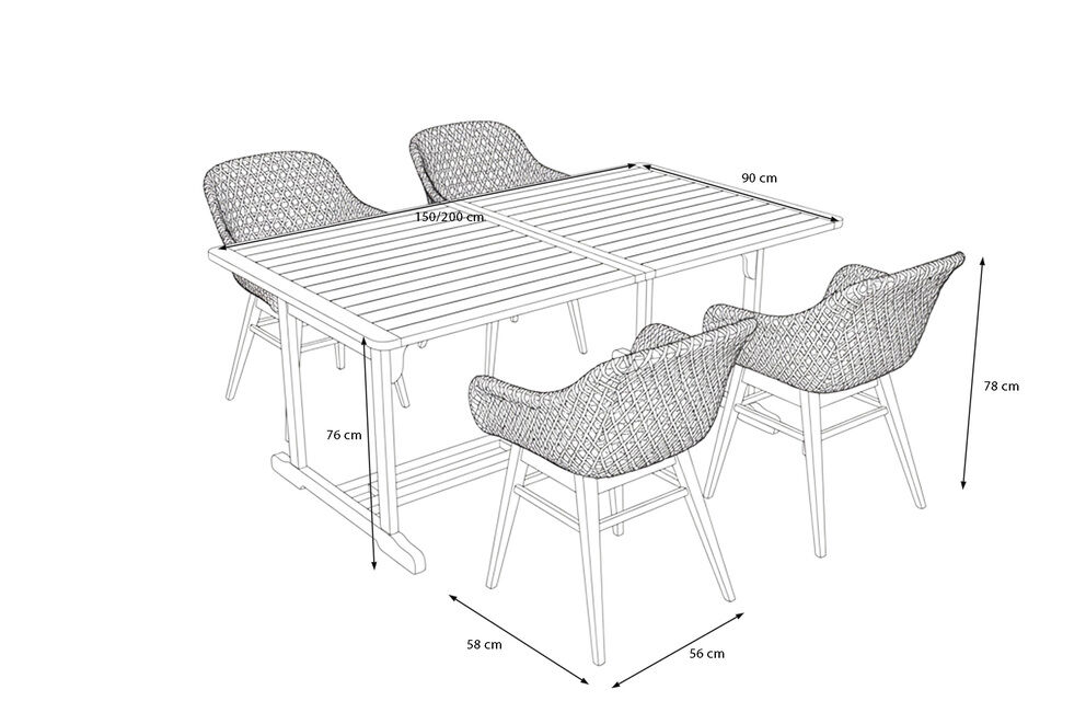 Mit Maßen von ca. 56 × 58 × 78 cm bieten die Dining Sessel ausreichend Platz und Komfort, während der Tisch mit ca. 76 cm Höhe optimal für gemütliche Mahlzeiten im Freien ausgelegt ist. Der Abstand zwischen den Tischbeinen sorgt für komfortable Beinfreiheit und angenehme Bewegungsfreiheit. Trotz seiner großzügigen Ausmaße ist der Tisch mit einem Gewicht von ca. 29,5 kg gut zu handhaben und stabil konstruiert.