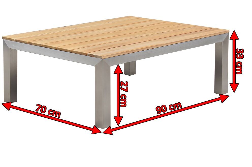 Das Gestell des eindrucksvollen Beistelltisches wurde aus gebürstetem Edelstahl angefertigt. Edelstahl eignet sich dank zahlreicher Vorteile ideal für die Herstellung von Gartenmöbeln. Das Material ist besonders stabil, witterungsbeständig, pflegeleicht und rostfrei. Das silberfarbene Gestell wird mit einer Tischplatte aus Teakholz kombiniert. Teakholz ist eine der beliebtesten Holzarten und überzeugt mit einer hohen Witterungsbeständigkeit und Haltbarkeit. Zusätzlich ist es extrem wasserabweisend. Die FSC-Zertifizierung garantiert Ihnen, dass dieses Möbelstück aus verantwortungsvollen Quellen stammt, sodass Sie sich guten Gewissens zurücklehnen und Ihre neuen Gartenmöbel so richtig genießen können.