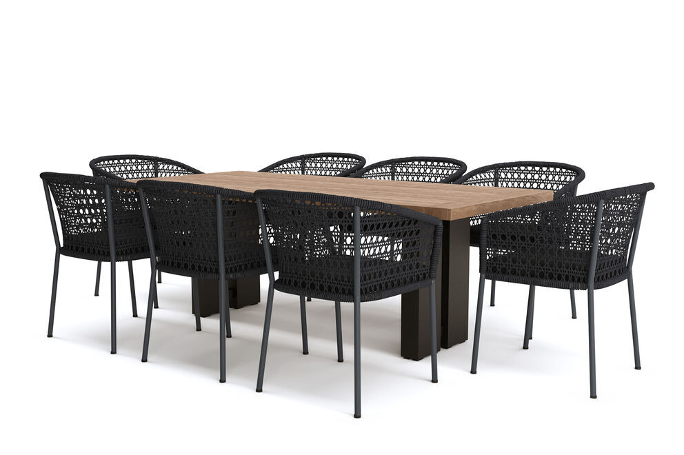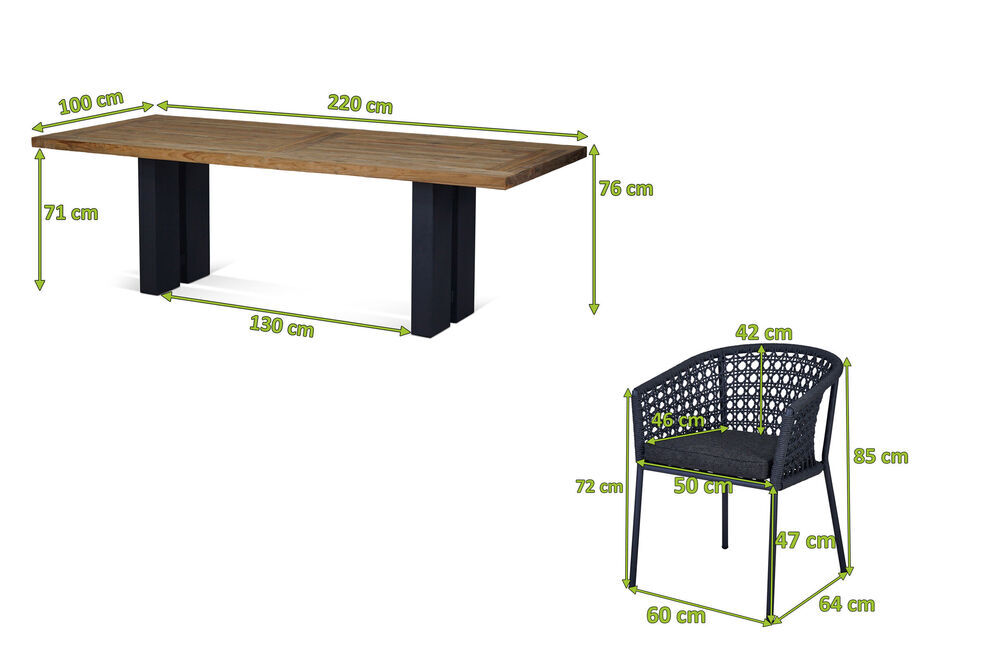 Ausgefallen, edel und robust zugleich präsentiert sich diese Design-Sitzgruppe aus dem Hause OUTFLEXX®. Das Set besteht aus einem schönen Esstisch mit den Maßen von ca. 220 x 100 x 76 cm und 8 bequemen Sesseln mit den Maßen von ca. 66 x 64 x 85 cm cm mit einer Sitzhöhe von ca. 47 cm und einer Sitztiefe von ca. 46 cm.