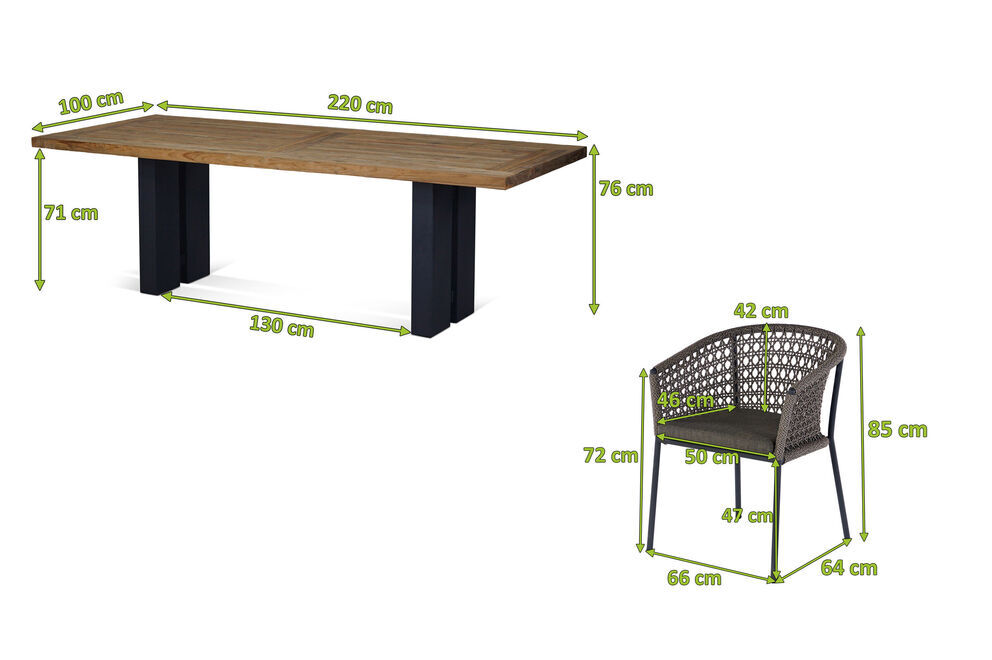Ausgefallen, edel und robust zugleich präsentiert sich diese Design-Sitzgruppe aus dem Hause OUTFLEXX®. Das Set besteht aus einem schönen Esstisch mit den Maßen von ca. 220 x 100 x 76 cm und 6 bequemen Sesseln mit den Maßen von ca. 66 x 64 x 85 cm cm mit einer Sitzhöhe von ca. 47 cm und einer Sitztiefe von ca. 46 cm.