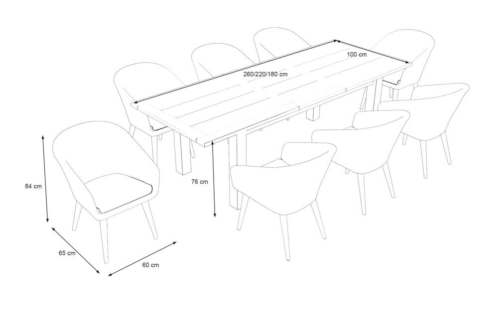Die Essgruppe besteht aus einem robusten Esstisch und sechs bequemen Cocktail-Sesseln. Der ausziehbare Tisch ist das Herzstück dieser eleganten Gruppe und bietet Platz für jede Gelegenheit. Gefertigt aus FSC-zertifiziertem Akazienholz, überzeugt der Tisch durch seine Langlebigkeit und Stabilität. Mit einem zweifachen Synchronauszug lässt sich die Tischplatte flexibel anpassen und bietet Ihnen eine variable Länge von ca. 180 cm, 220 cm bis zu ca. 260 cm. So haben Sie immer genügend Platz für all Ihre Gäste.