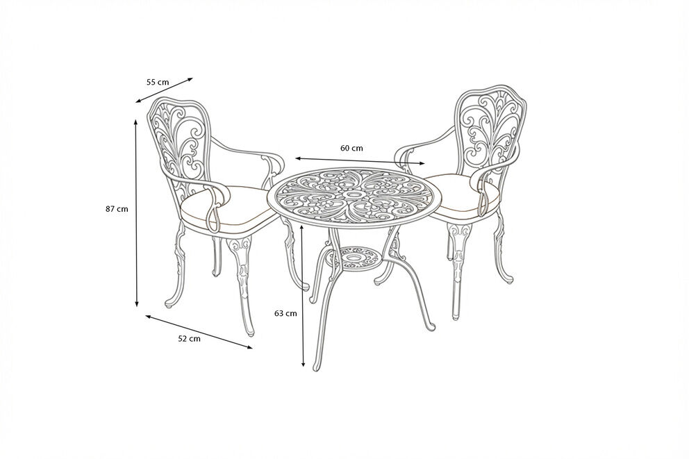 Das Set besteht aus einem stilvollen Tisch mit einem Durchmesser von ca. 60 cm und zwei bequemen Stühlen mit Armlehnen. Das Gestell aus Gussaluminium ist pulverbeschichtet und somit besonders widerstandsfähig gegen Witterung, Rost und Korrosion. Die Oberfläche zeigt eine feine, bronzefarbene Struktur mit klassisch-verspielten Ornamenten – ein zeitloser Blickfang für Ihren Außenbereich.