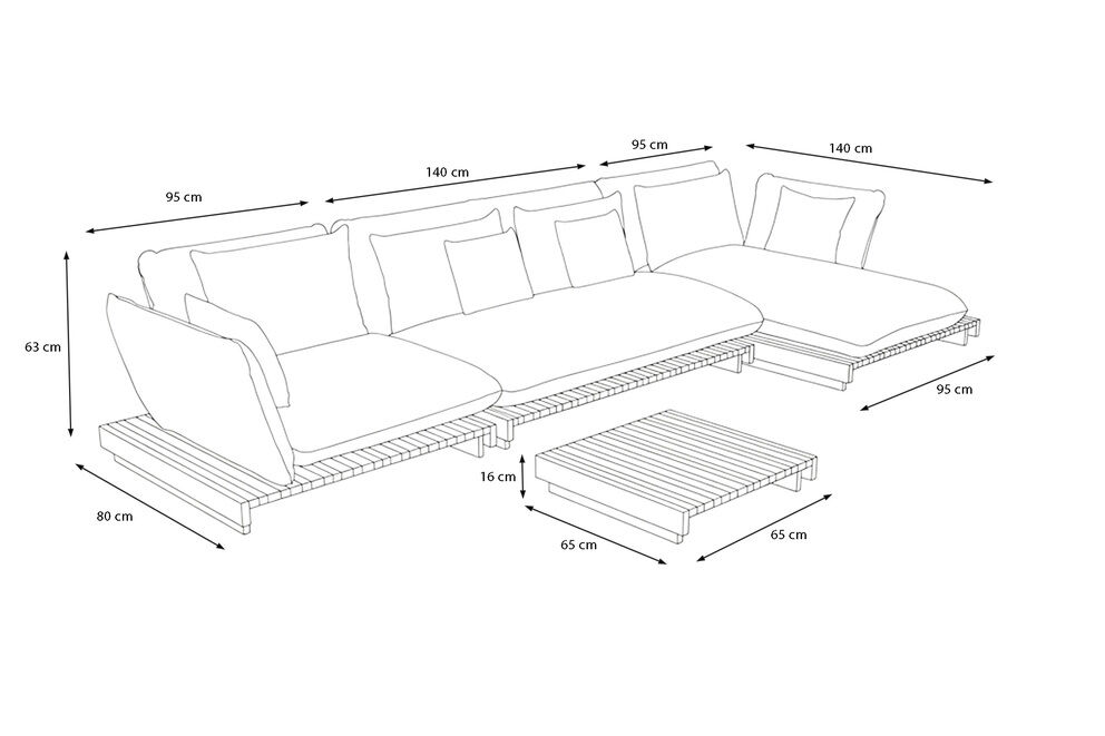 Das Gestell aus pulverbeschichtetem Aluminium überzeugt durch hohe Stabilität und ist zugleich korrosionsbeständig sowie pflegeleicht. Die Tisch- und Seitenelemente bestehen aus massivem Teakholz FSC® 100 % in naturfarbener Optik – ein Material, das durch seine Widerstandsfähigkeit und seine warme, natürliche Ausstrahlung besticht. Die Kombination dieser Materialien sorgt für eine langlebige, wetterbeständige Lounge, die auch optisch höchsten Ansprüchen genügt.