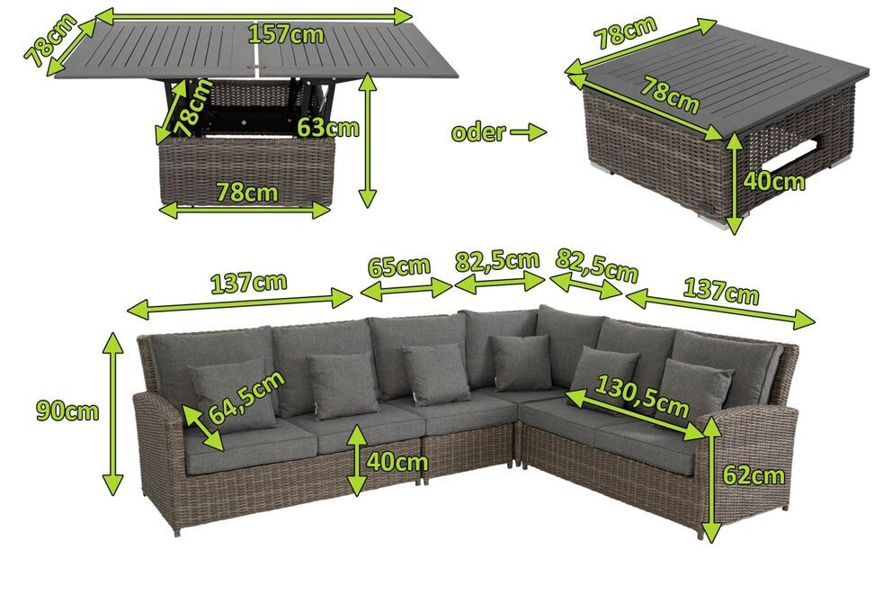 Diese gemütliche Loungegruppe von OUTFLEXX® ® bietet bequem bis zu sechs Personen Platz. Die Sitzhöhe von ca. 30 cm (ohne Kissen) macht die Lounge zum Allround Talent - hier können Sie gemütlich in der Sonne liegen, aber auch ganz bequem ein leckeres Abendessen zu sich nehmen. Das Set besteht aus zwei 2er Sofas (ca. 137 x 82,5 x 90 cm), einem Eckelement (ca. 82,5 x 82,5 x 90 cm) und einem einzelnen Mittelelement (ca. 65 x 82,5 x 90 cm), so können Sie die Schenkellänge flexibel wählen und die Lounge bequem an Ihre Gegebenheiten zuhause anpassen. Der praktische Esstisch bietet dank seiner Maße von ca. 78/157 x 78 x 40/63 cm genügend Platz. Die Tischplatte ist ca. 1,5 cm dick und besteht aus beschichtetem Aluminium, dies verleiht dem Tisch einen edlen Charakter und ist zudem besonders pflegeleicht. Der Tisch ist ideal als Kaffee- und Esstisch einsetzbar: Dank der variablen Tischhöhe müssen Sie auf keinen Komfort verzichten. Einfach die Tischplatte aufklappen und das Scherengestell hochziehen - schon können Sie mit vier Personen an diesem Tisch in bequemer Höhe tafeln. Aufgeklappt hat der Tisch eine Höhe von ca. 63 cm und eine Länge von ca. 157 cm. Zur Rückverwandlung schieben Sie einfach die Einrasthebel zurück, so dass sich das Gestell einfach zusammenklappen lässt. Zum Schutz vor starken Witterungseinflüssen ist im Lieferumfang dieses Tisches eine hochwertige Abdeckhaube enthalten.