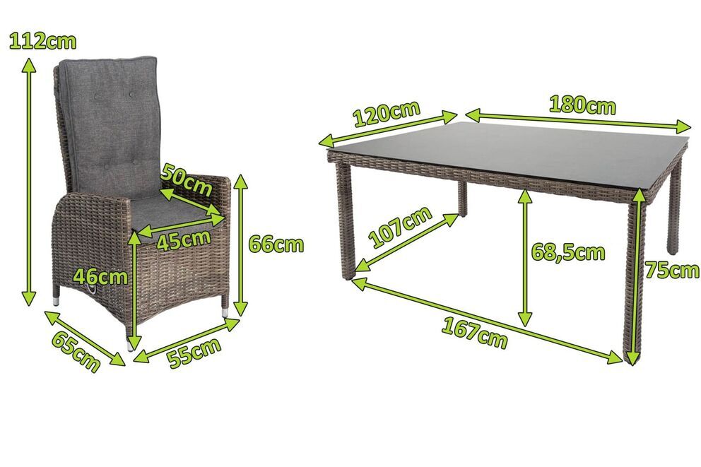 Dieses gemütliche Gartenmöbel Set bietet bequem bis zu sechs Personen Platz. Das Set besteht aus sechs Dining Sesseln und einem Dining Tisch. Hier können Sie bequem Ihr Mittag- oder Abendessen zu sich nehmen - und danach mit einem guten Buch in der Sonne liegen. Hierzu brauchen Sie einfach nur Platz zu nehmen und beim Sessel und den Sofas problemlos eine bequeme Liege- oder Sitzposition einstellen. Dies gelingt kinderleicht dank der integrierten Gasdruckfeder - die Rückenlehnen können mit einem kleinen Hebel an der Seite stufenlos verstellt werden. Der Sessel hat ein Gesamtmaß von ca. 65 x 55 x 112 cm. Die Sitzfläche ist ca. 50 cm tief, die Sitzhöhe mit Kissen liegt bei ca. 46 cm. Die Armlehnen mit einer Höhe von ca. 66 cm sorgen bei diesem Sessel für besonderen Komfort. Der praktische Diningtisch bietet dank seiner Maße von ca. 180 x 120 x 75 cm Platz für sechs bis acht Personen - so steht einem gemütlichen Mittagessen mit der Familie nichts im Wege. Er wird mit einer ca. 8 mm starken Spraystone Platte geliefert. Spraystone ist ein Kunststoff-Stein-Gemisch, das bei diesem Artikel auf Sicherheitsglas aufgesprüht und anschließend eingebrannt wird. Daraus ergibt sich eine wetter- und kratzfeste sowie pflegeleichte Oberfläche in einer eleganten Natursteinoptik, die sich mit einem milden Reiniger und einem Lappen kinderleicht pflegen lässt.