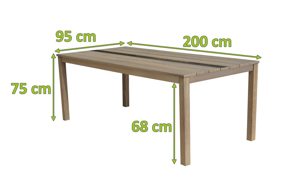 Er benötigt nicht viel Schnickschnack um selbst den anspruchsvollsten Gartenliebhaber zu überzeugen. Das verwendete Teakholz verleiht diesem Tisch einen ganz besonderen Charme. Die gebürstete Oberfläche sorgt dafür, dass die natürliche Struktur des Holzes erhalten bleibt und die Maserung besonders gut zum Vorschein kommt. Das Zusammenspiel aus dieser rustikalen Oberfläche und dem aus Edelstahl gefertigten Gestell verleiht dem Tisch sein besonderes Aussehen und sorgt dafür, dass er sich zu nahezu jeder Garteneinrichtung harmonisch kombinieren lässt. Mit den Maßen von ca. 200 x 95 x 75 cm bietet er ausreichend Platz für 6 Personen. Die Stärke der Tischplatte von ca. 2 cm und die Beine aus Teakholz unterstreichen das rustikale und dennoch moderne Design zusätzlich.