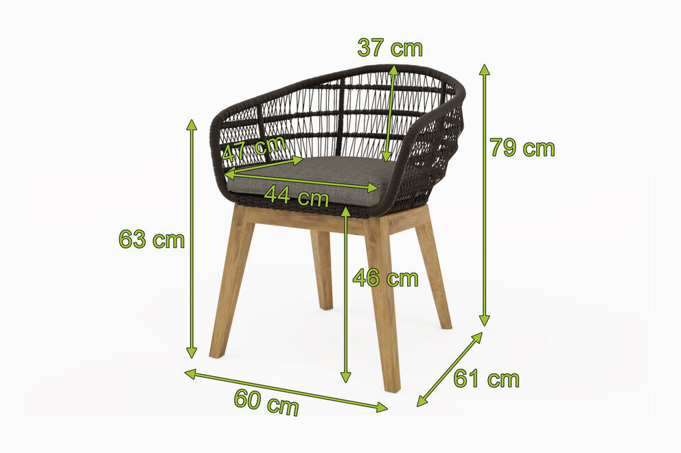 Die Sitzschale ist mit dem flexiblen Material Rope in der Farbe Schwarz bespannt. Das Unterteil des Stuhles besteht aus hochwertigem Teakholz in der Farbe natur. Teakholz zeichnet sich vor allem durch seine Widerstandsfähigkeit und Härte sowie seine elegante Maserung aus. Dieser Diningsessel integriert sich durch die Material- und Farbkombination dezent in alle möglichen Terrasseneinrichtungen. Teakholz ist zudem ein Naturprodukt und lässt so jedes Möbelstück zu einem Einzelstück werden. Diese Natürlichkeit wird mit der allmählichen Patinabildung in einem schönen Silbergrau unterstrichen. Wenn Sie dieser entgegen wirken möchten, empfehlen wir Ihnen eines unserer Pflegeöle, welches Sie im Zubehör finden.