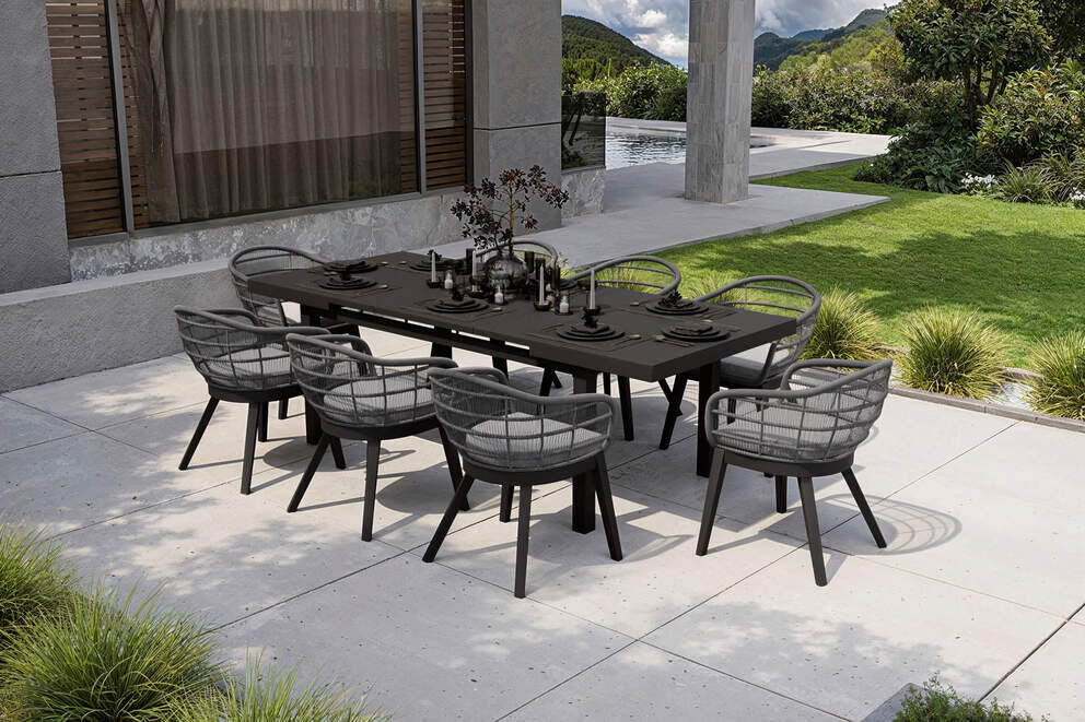 Anthrazit matt und grau setzen elegante Akzente und passen sich harmonisch in jede Umgebung ein. Die stilvolle Optik macht diese Essgruppe zum Mittelpunkt Ihrer Terrasse und kombiniert modernes Flair mit zeitloser Eleganz. |
